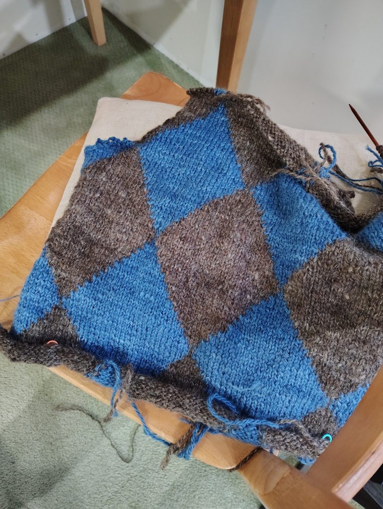 I’ve also found that since I’ve been working on this, I’m noticing argyle in movies we’ve been watching. At least three argyle vests in Purple Rose of Cairo, and argyle socks in Hitchhikers Guide to the Galaxy.