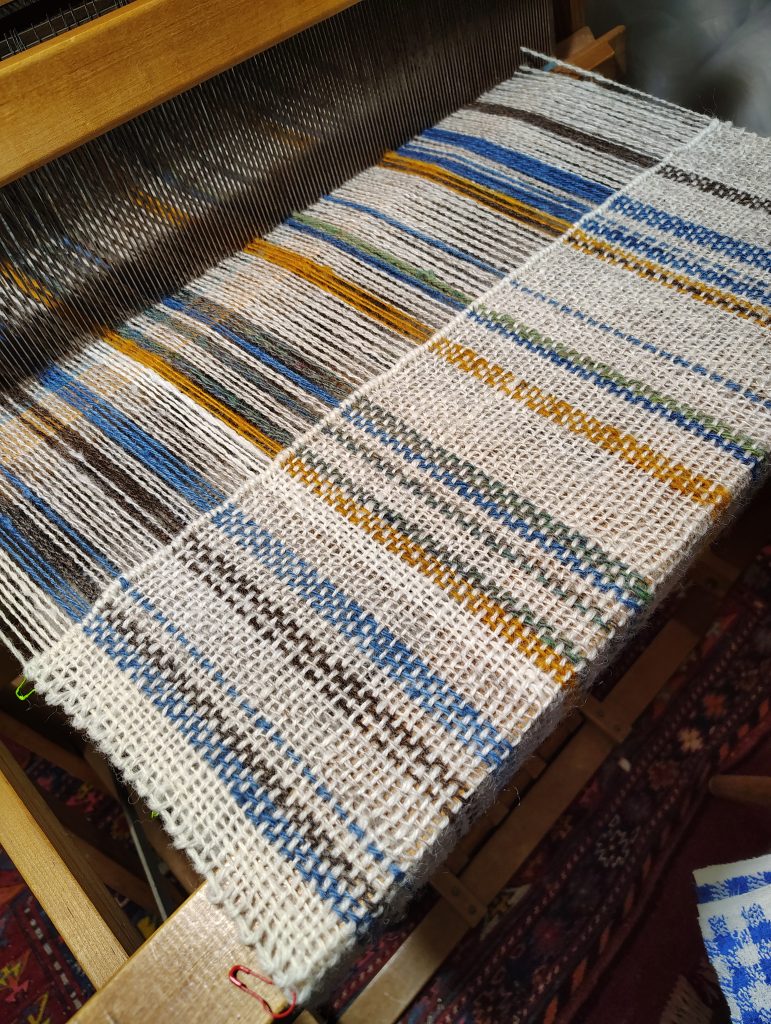 Some of the same colors here- plus a nice strong gold from walnut leaf/dahlia dye at the dye day this past summer, and also some misc blended greens from the stash to round it out. Colors only in the warp this time so that all the stripes will be vertical, and repeated three times in the finished blanket. Weft is going to be all white (Rosie, from Linda Smuzer’s donated stash). Really lovely stuff! It’s lighter weight (in both warp and weft) than the first blanket, so I did 8 ends per inch, and expect that it will be quite a bit lighter, though hopefully still nice and fuzzy once fulled.