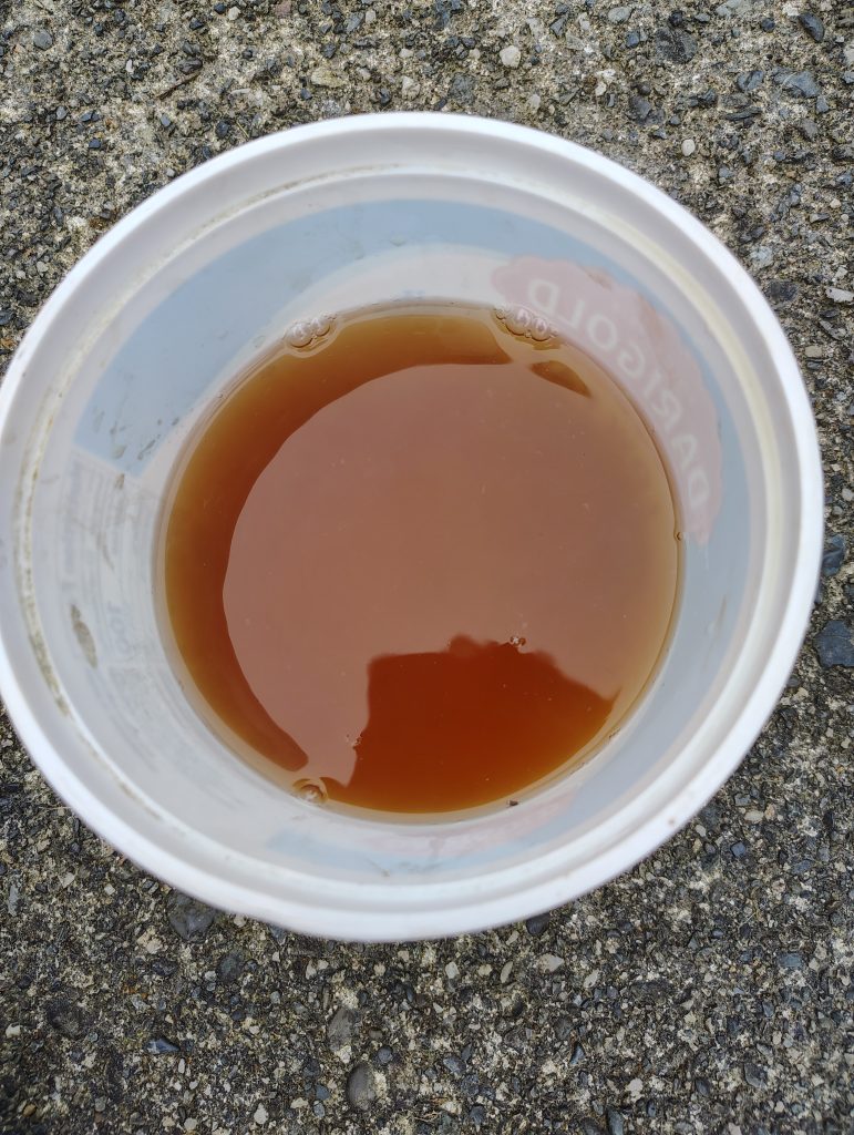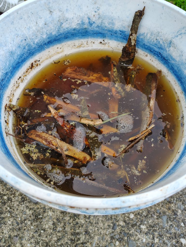 I had an opportunity a week or so ago to cook it up- here’s the bucket with the soaking bark before heating (nevermind the indigo residue ring!)