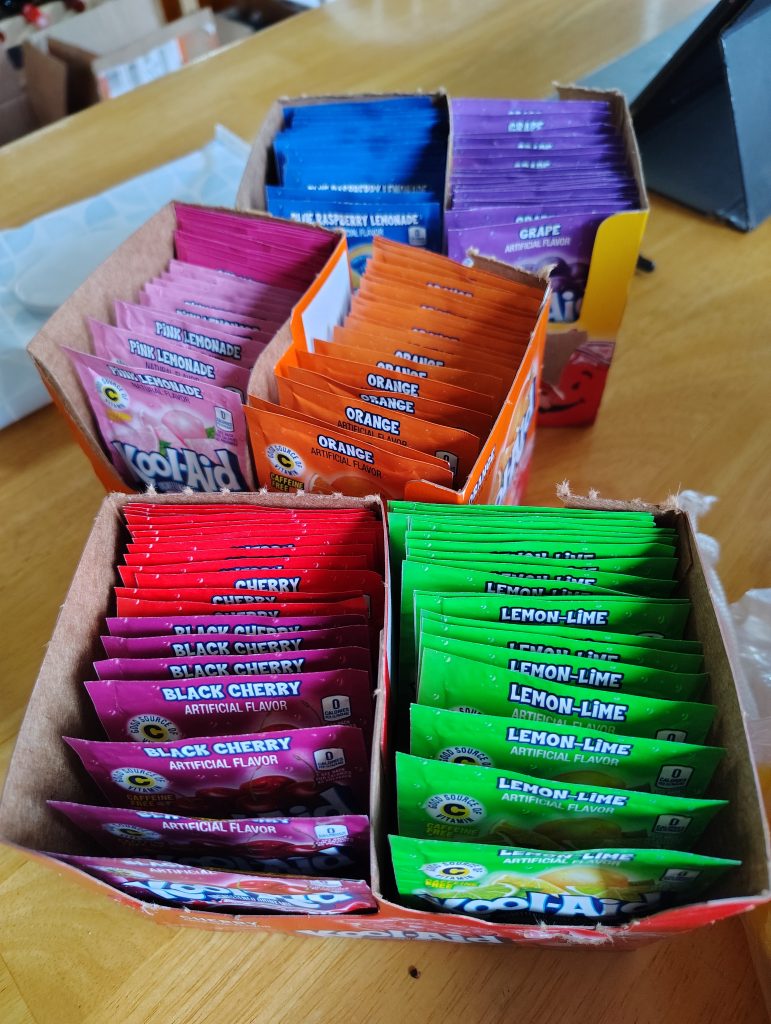 120 packets should be enough to dye about 60 oz of wool, so hopefully we’re all set there. KoolAid yellow (lemonade) is kind of weak, so we might just use regular food coloring for that.