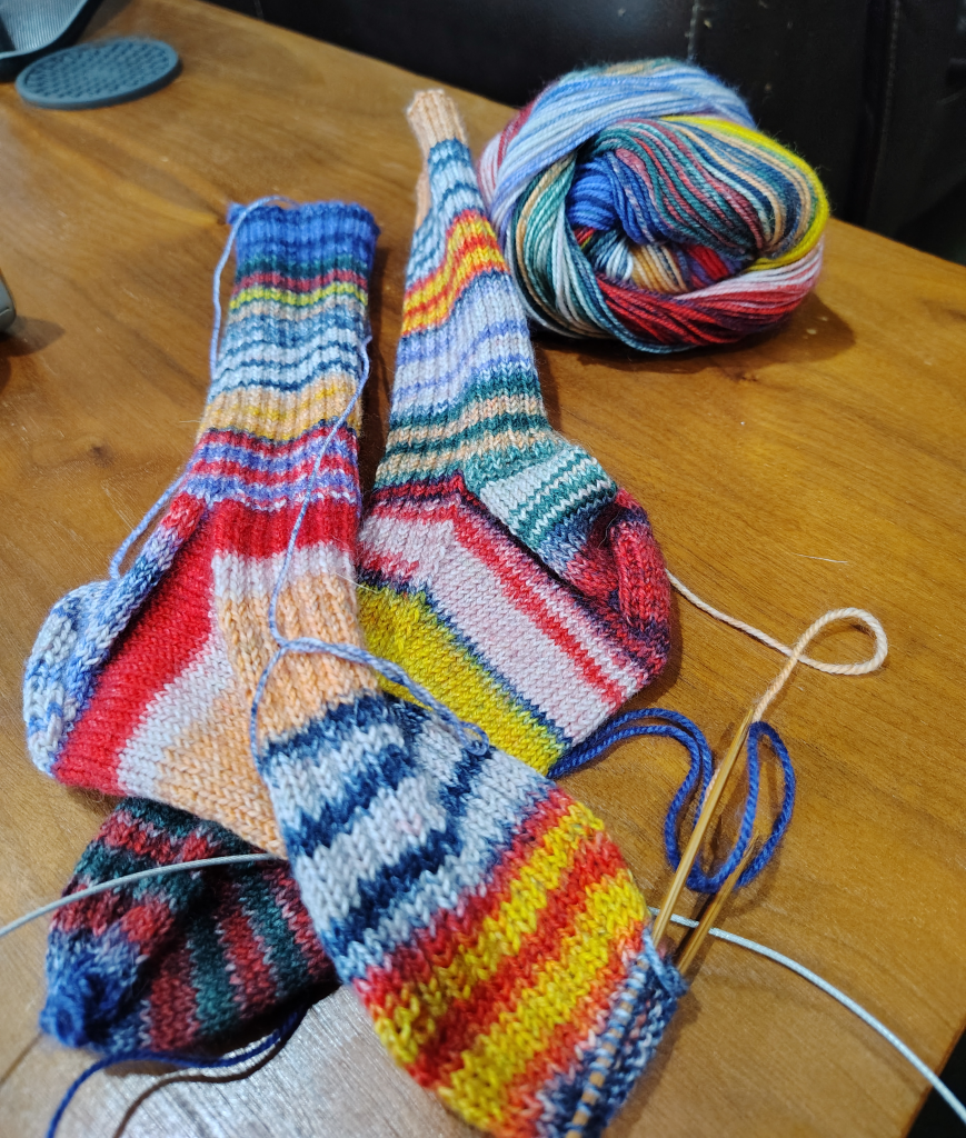 And speaking of superwash- I just finished up a pair of fun and funky socks for a friend. All done but the toe grafting