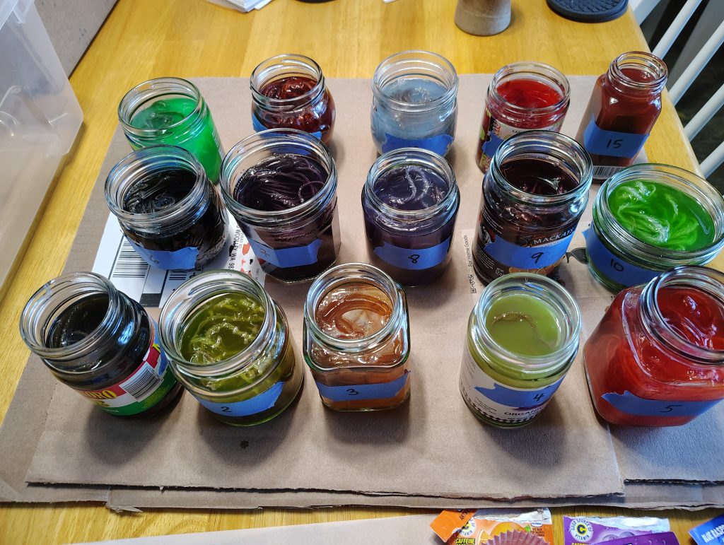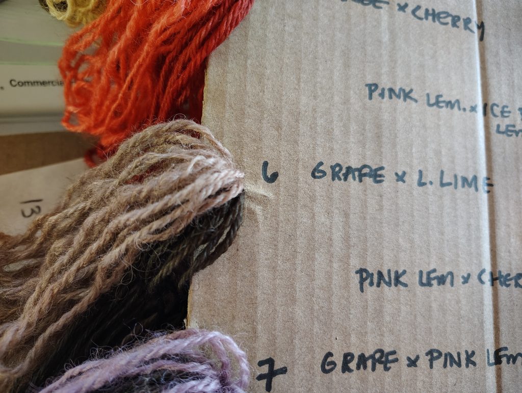 This morning I cooked up a set of blended mini skeins, trying out all possible combinations of these six flavors: Orange, Grape, Blue Raspberry Lemonade, Pink Lemonade, Cherry, and Lemon-Lime