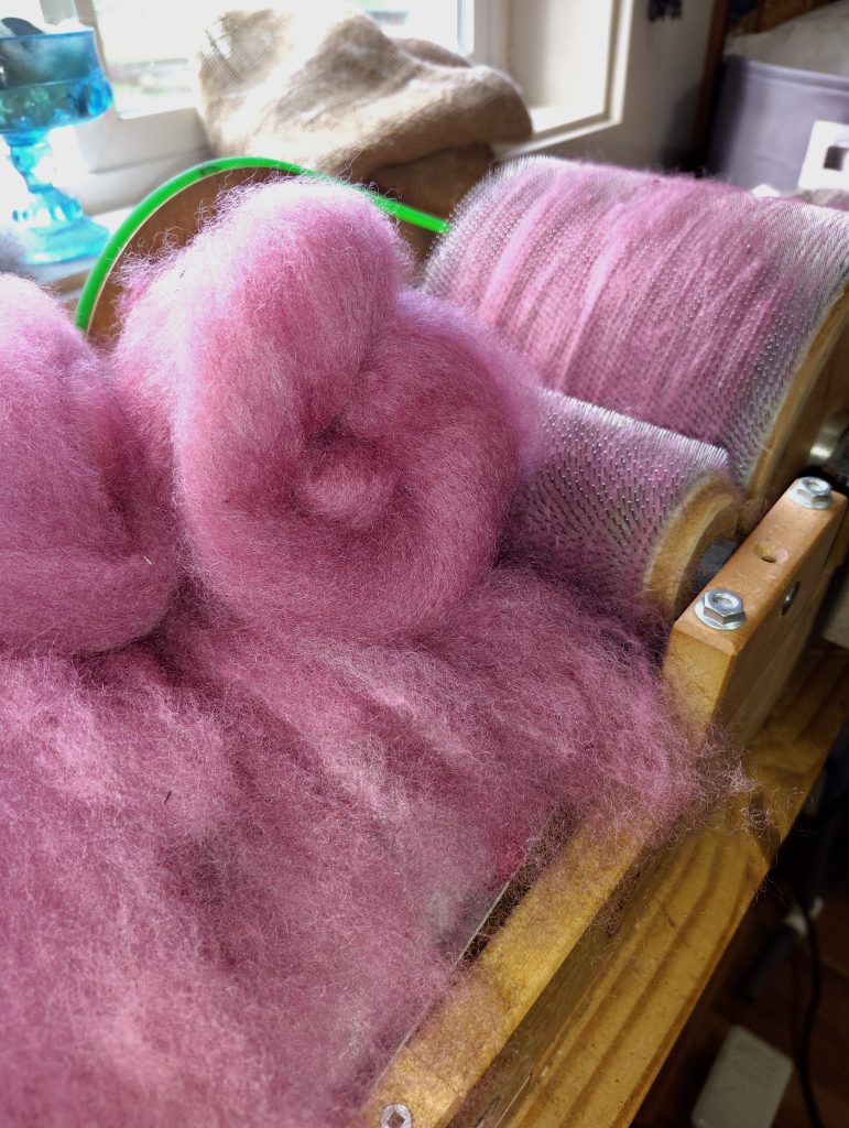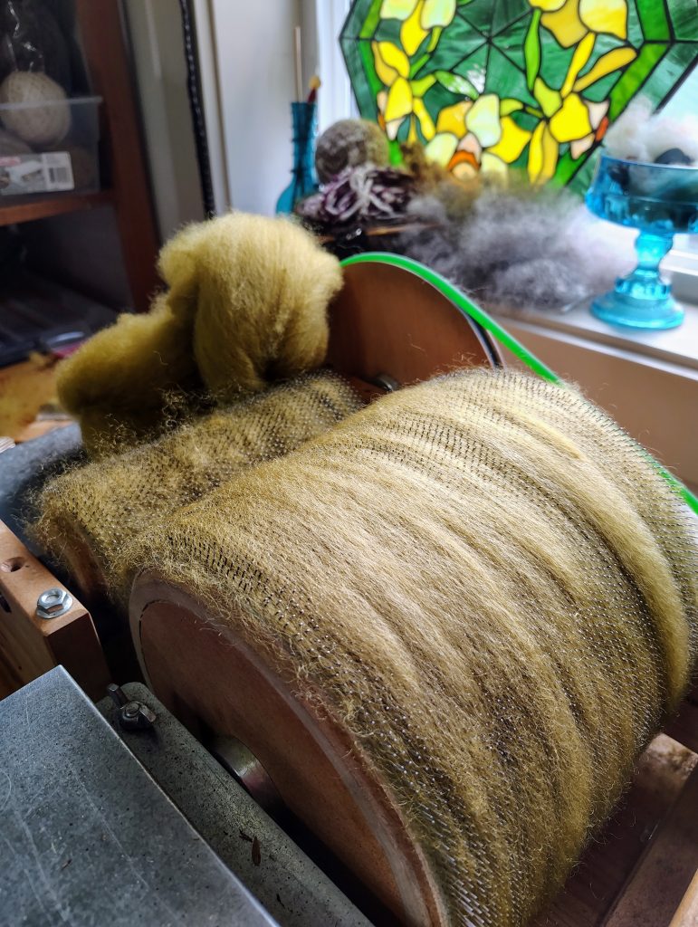 Spent some time this morning picking and carding Esther fleece that I dyed last summer-