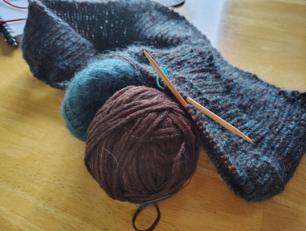 Also decided to knit it bottom-up rather than top-down (primarily because short rows for neckline and shoulder shaping aren’t great for social knitting). So for now I’m just going round and round alternating knit and ribbed rows. I find ribbing very relaxing. Will see how far the blue mohair gets me up the body. Not sure it I’ll change roving color when the mohair switches or not. Have a couple shades of roving and mohair to play with.