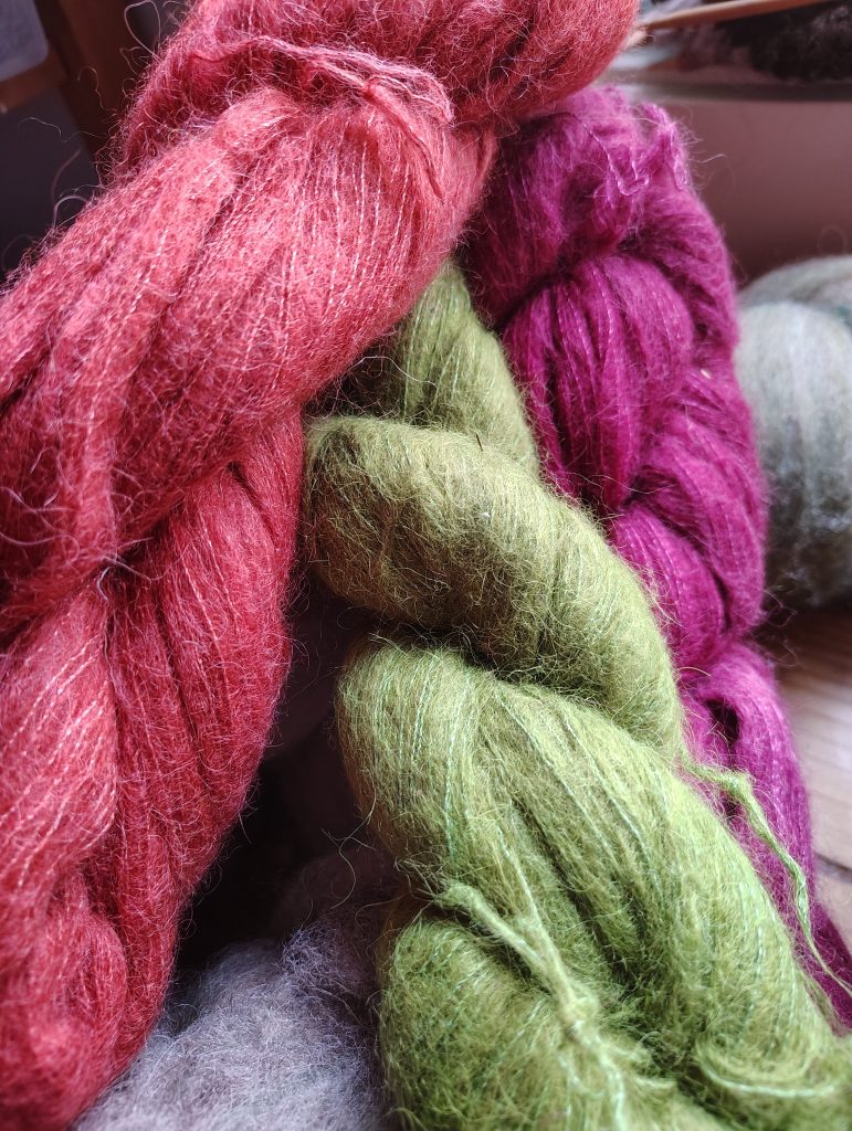 That is the resulting two-ply yarn of the blendy colors on the left, and a lovely icelandic/silk blend that I picked up from Skagit Woollen Works on the right-