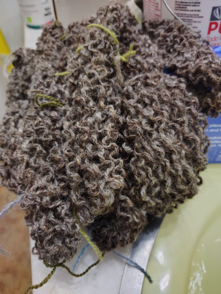 Can’t remember the source of the wool for this yarn, but it’s a beautiful dark brown with bleached tips. It’s really too heavy for a sweater, but I think it will make good blanket warp! The sweater had a colorwork pattern around the chest, and I decided that I could re-use that to make a nice plump cushion for my weaving chair-