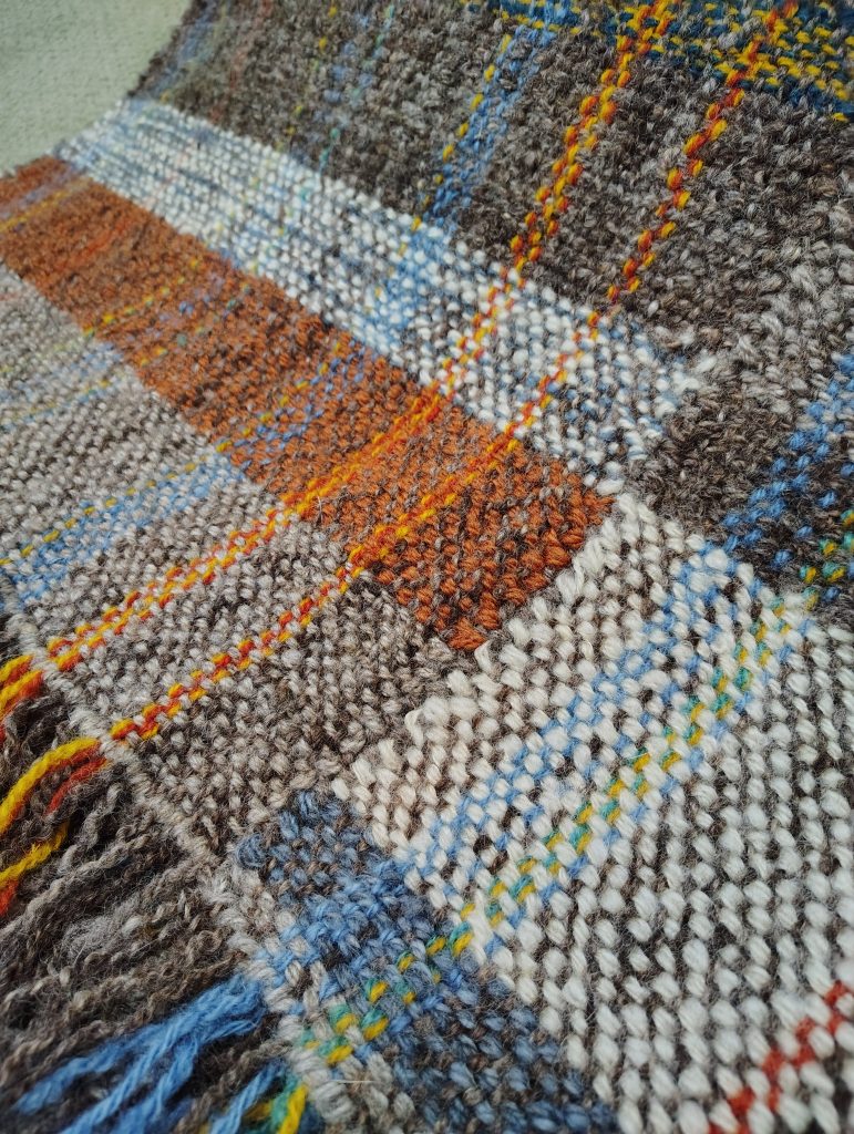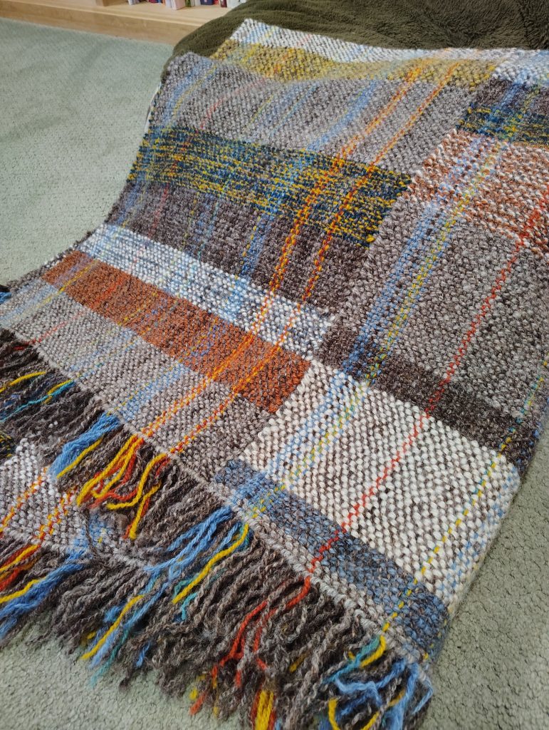 Feels good to have repurposed all that handspun from the ill-fated saddle shoulder sweater of years ago. And I like how the strong colors really pop out from the dark warp.